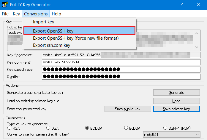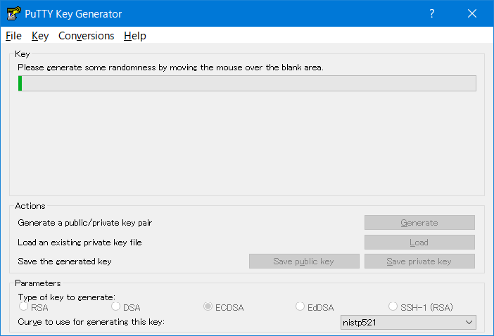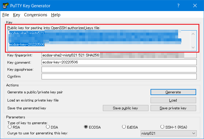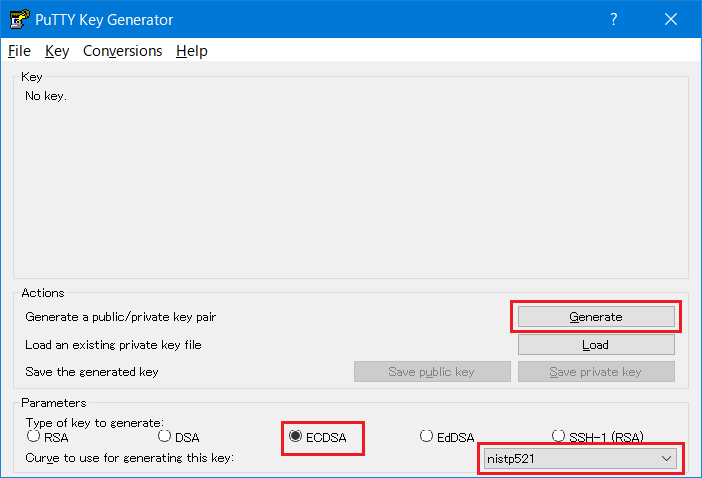 Select “ECDSA” for type of key to generate and “nistp521”, then click “Generate”.
