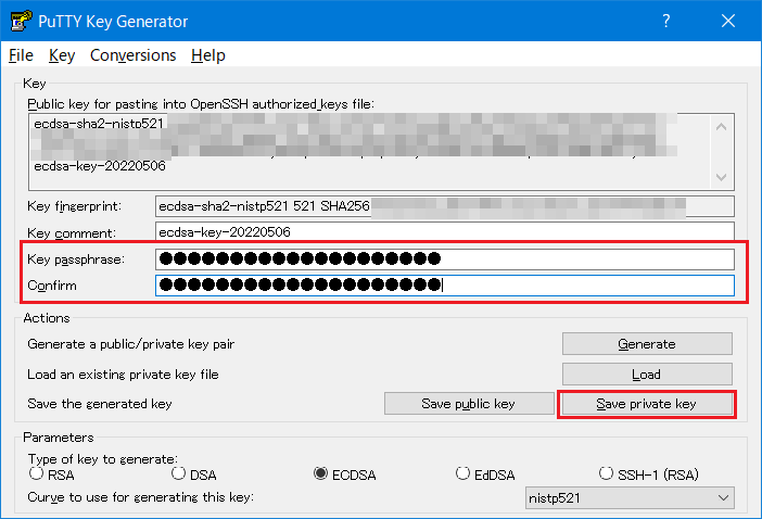 Input a passphrase to both “Key passphrase” and “Confirm passphrase”. After inputting, click “Save private key” and save the private key. The file saved here is used when you want to reconfirm the public key.