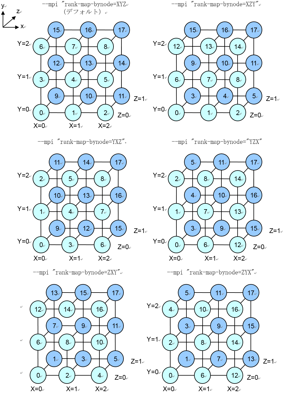rank-map-bynodeは、計算ノードに1プロセスを生成すると、次の計算ノードに移動し、ラウンドロビンで自動的に割り付けます。座標の原点をランク0とし、rank-map-bynodeの先頭文字の軸方向にランクを並べ、上限まで達した時点で、次の文字に移動します。
